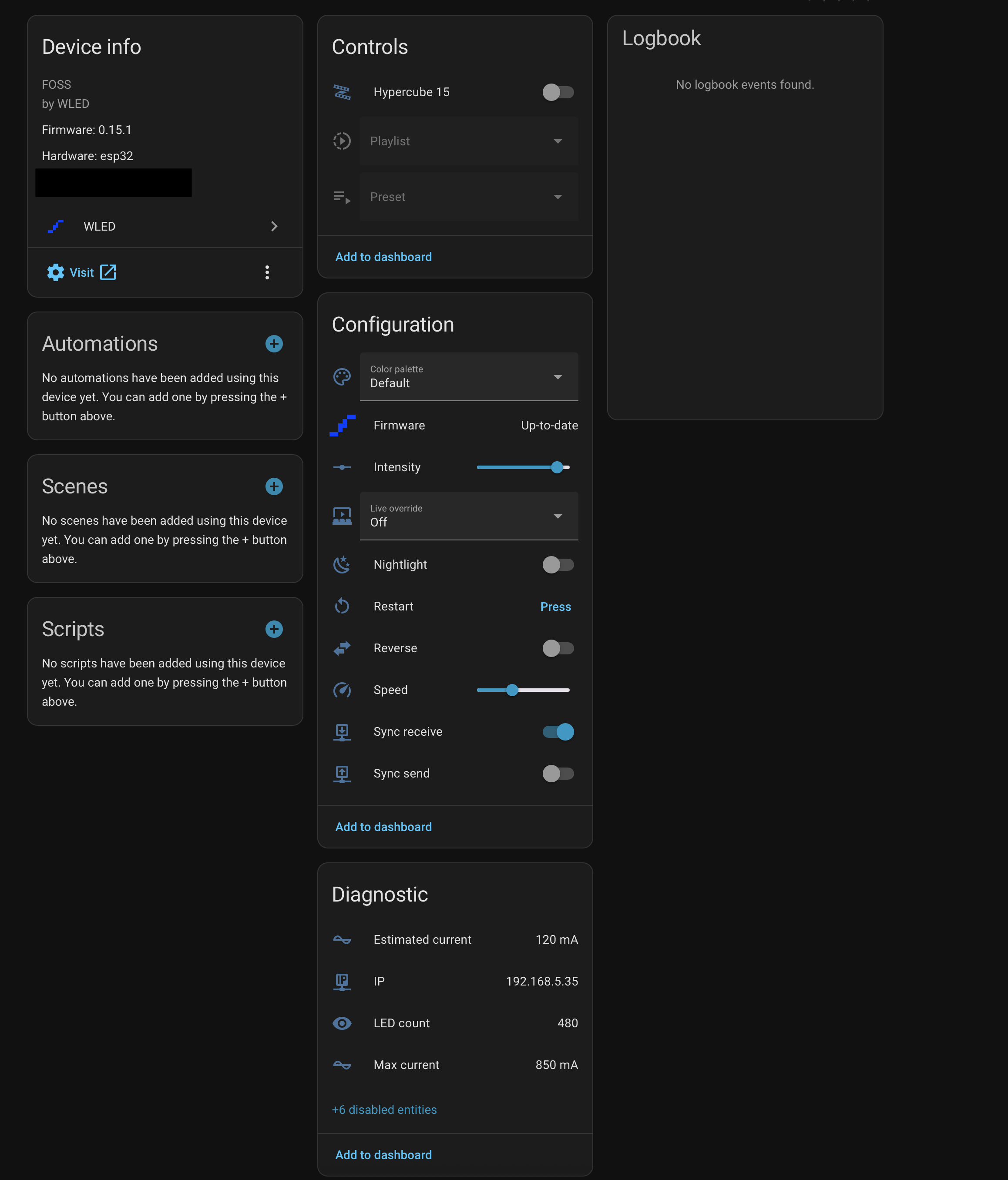 So that’s all there is to it. The hard part was figuring out which pads were which, but once that was sorted the Web Installer made the flash painless. Now the HyperCube controller runs stock WLED, can be updated OTA, and integrates cleanly with HA. No more dealing with the proprietary fork or opening the case again.