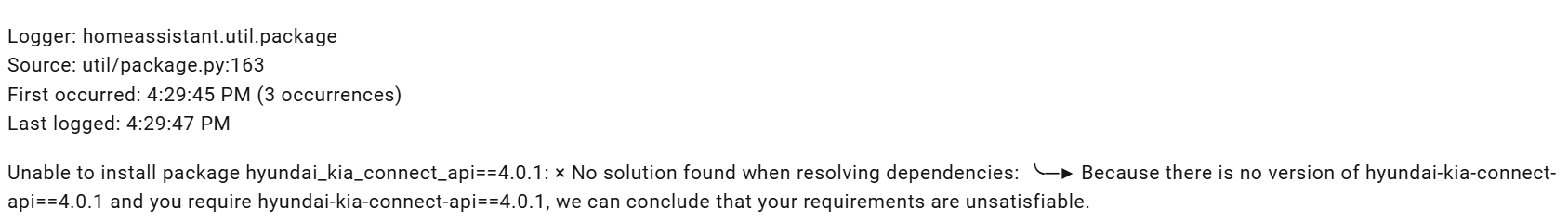 Unable to install package hyundai_kia_connect_api==4.0.1: × No solution found when resolving dependencies: ╰─▶ Because there is no version of hyundai-kia-connect-api==4.0.1 and you require hyundai-kia-connect-api==4.0.1, we can conclude that your requirements are unsatisfiable.
