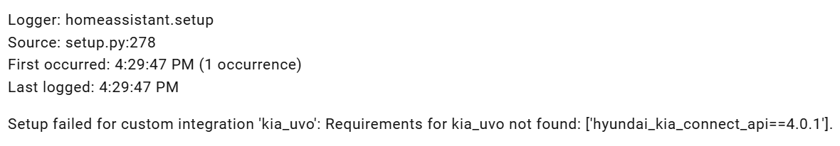 Setup failed for custom integration 'kia_uvo': Requirements for kia_uvo not found: ['hyundai_kia_connect_api==4.0.1'].