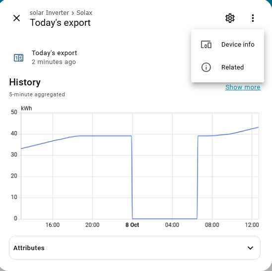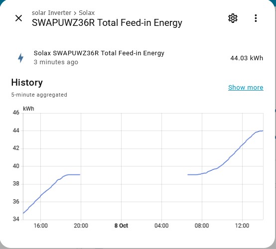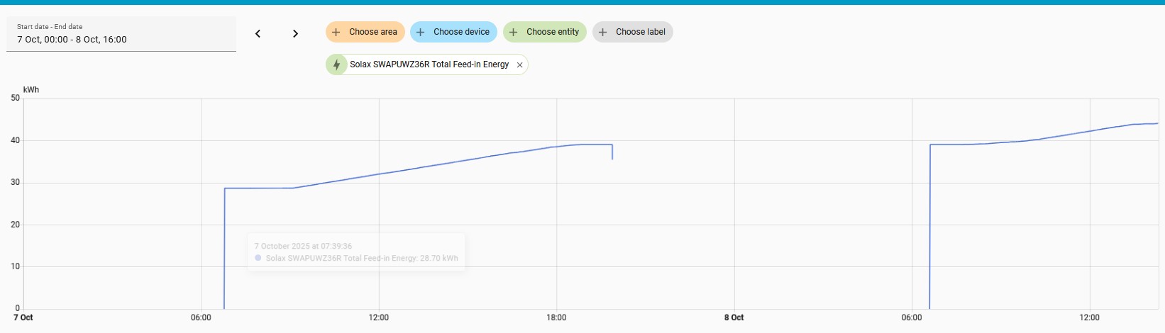 This used to work on a running total that was available 24/7 (Eastron meter), now I only have the running total available when the Solax inverter is running during the day. This graph is from the next day after I created the meter.