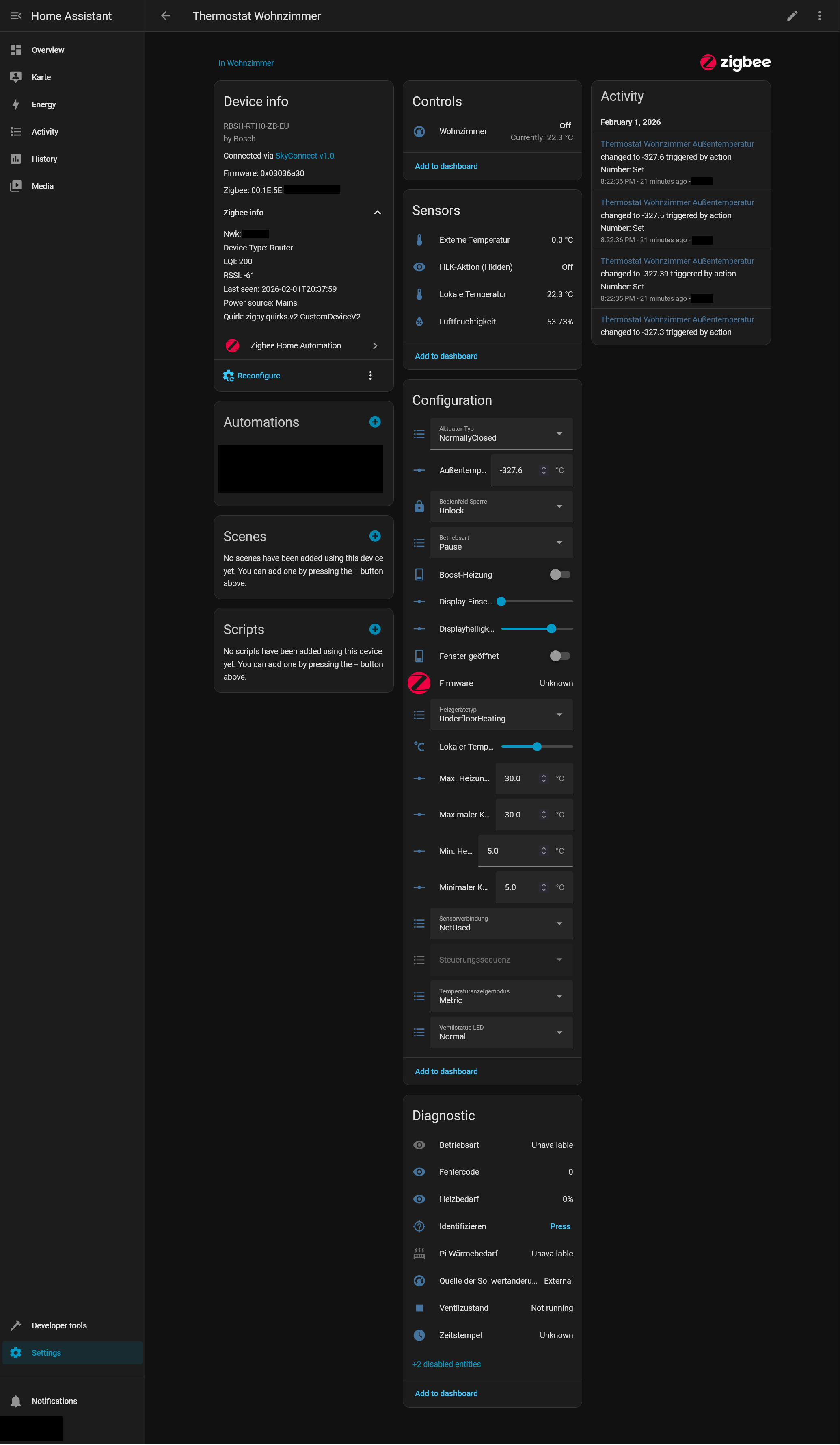 The thermostats are connected via Zigbee and integrated into Home Assistant. I’m not using a Bosch Smarthome Controller because I wanted a local-only setup. In Home Assistant, all thermostats are disabled (turned off, not entity disabled), yet it still feels like the heating is running anyway.