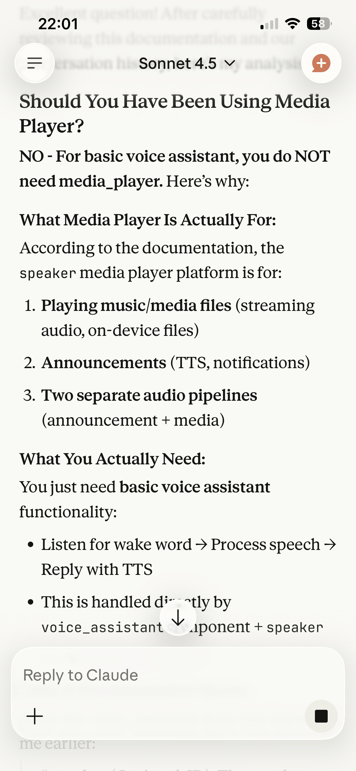 Even last night I was trying to get the aforementioned WarLion code to work with Claude and in that particular case the info isn’t getting to the speaker (yes, I have pipelines set up - I even set up a home assistant cloud pipeline which then managed to crash my system and stop HA working for an hour). Claude decided that the power coming from the 5v from the seeed s3 wasn’t enough for the max 98357a and I should try it with an external 5v directly to that as well as the esp. again though, I’ve literally never seen anybody doing that. Heck, AI tells me that esp boards can’t run any more than one LED but that seems just wrong.