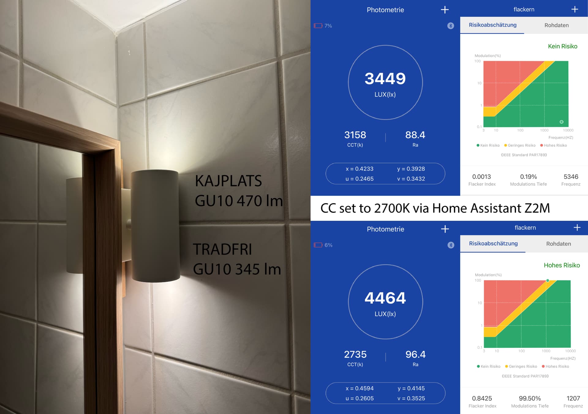 By naked eye i can observe a lower CRI and a tint shift towards green. The tradfri, with its slight magenta shift, feels more pleasent. Colors (RGB) in general render much nicer on Kajlats, but when it comes to whites, i could imagine they traded CRI for lm.