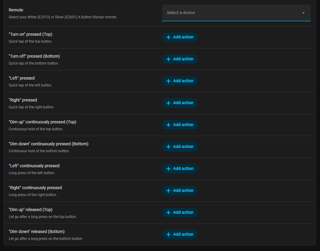 This blueprint provides comprehensive mapping for all 10 possible interactions for the IKEA Styrbar remote series. It is compatible with both the Silver (E2001) and White (E2313) variants.