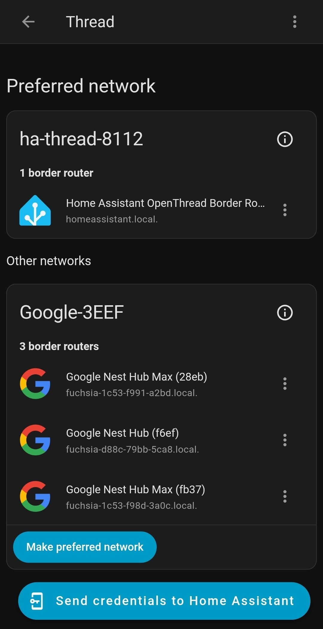 After this, you can sync the Thread creds from HA, but first make sure the ha-thread-8112 network has an icon of a “key in a phone” which requires you to click the 3-dots set credentials for use w. iOS/Android