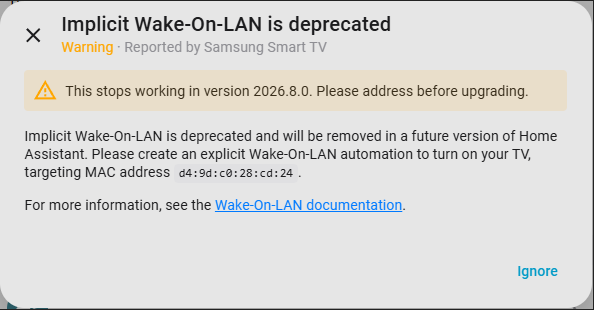 I have also the same message, but am not using any automation with wake-on-lan. I have only something like that: