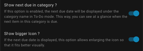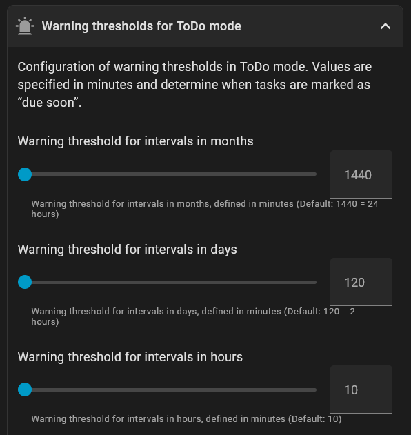 In ToDo Mode, you can configure when upcoming tasks are visually marked as “due soon” based on configurable warning thresholds. These thresholds are defined in minutes and differ depending on the type of interval or due date format: