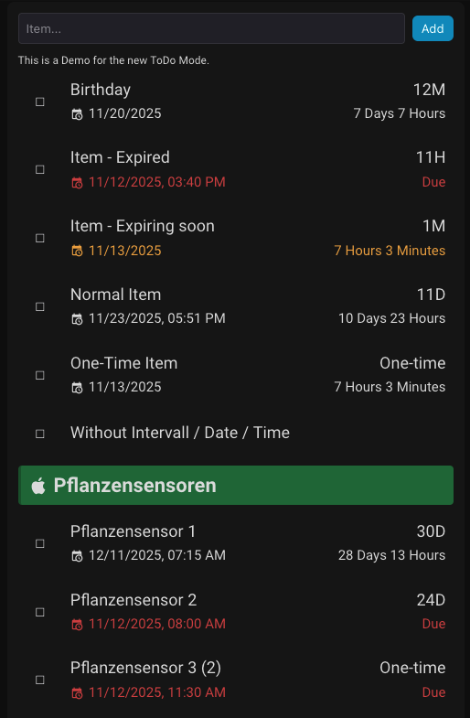 The new ToDo Mode transforms the Home Assistant ToDo list into a kind of task manager with recurring due date functionality.