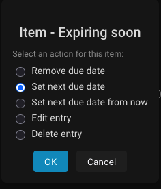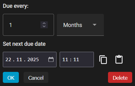 - Flexible options when marking tasks complete, such as removing the due date or scheduling the next due date based on custom intervals.
