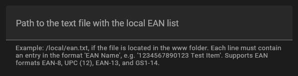 In the future, I might add support for a local EAN list (similar to the local categories or local chips feature).