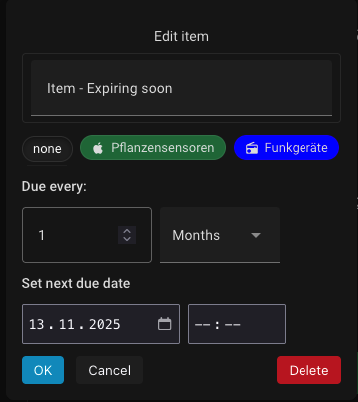 - Visual indicators for upcoming or overdue tasks with configurable warning thresholds (currently only via YAML, see below).