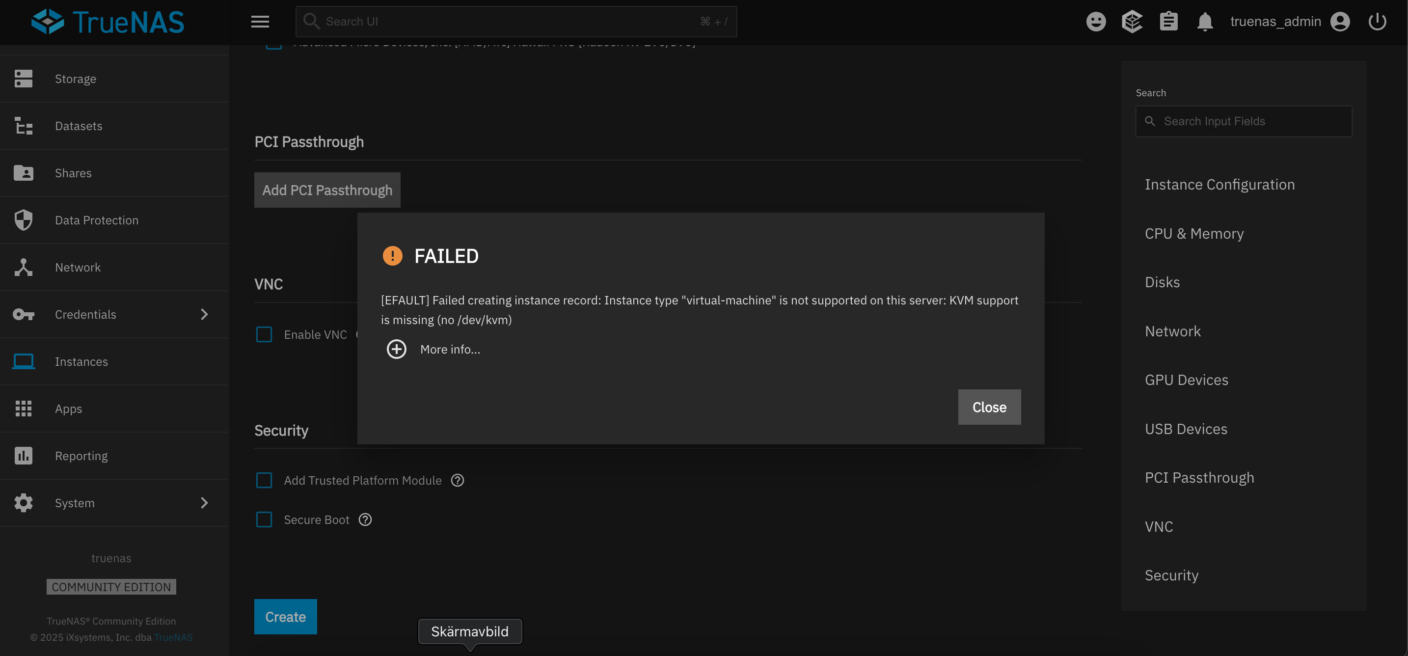 If so, please confirm that KVM support is enabled in the BIOS. If it is, we may be looking at a bug in TrueNAS.