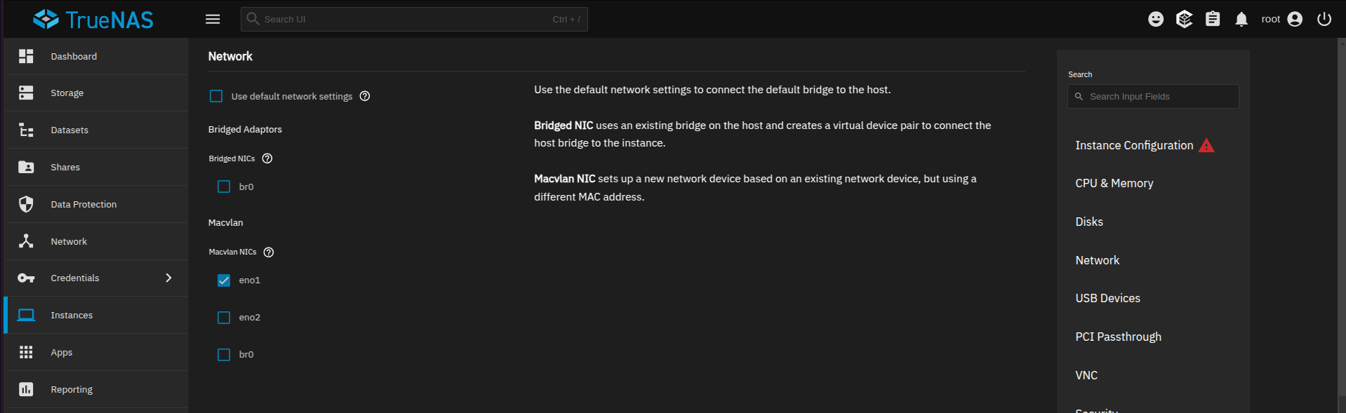 And when creating the VM, I attached it to the bridge I created on TrueNAS. Notice that my bridge br0 shows up under Bridged Adaptors and Macvlan. I needed to select the first one for it to work