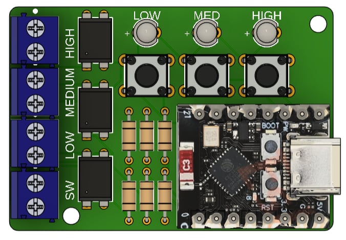 The board is a prototype with a display and buttons, but the intent will be to strip it back to just a ESP8266 that can hide in the MVHR unit