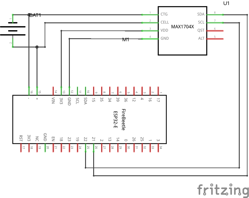 As described here I want to see the remaining battery voltage and energy percentage from an MAX17043 i2c bus sensor connected to an ESP32 board (DFR firebeetle rev4).