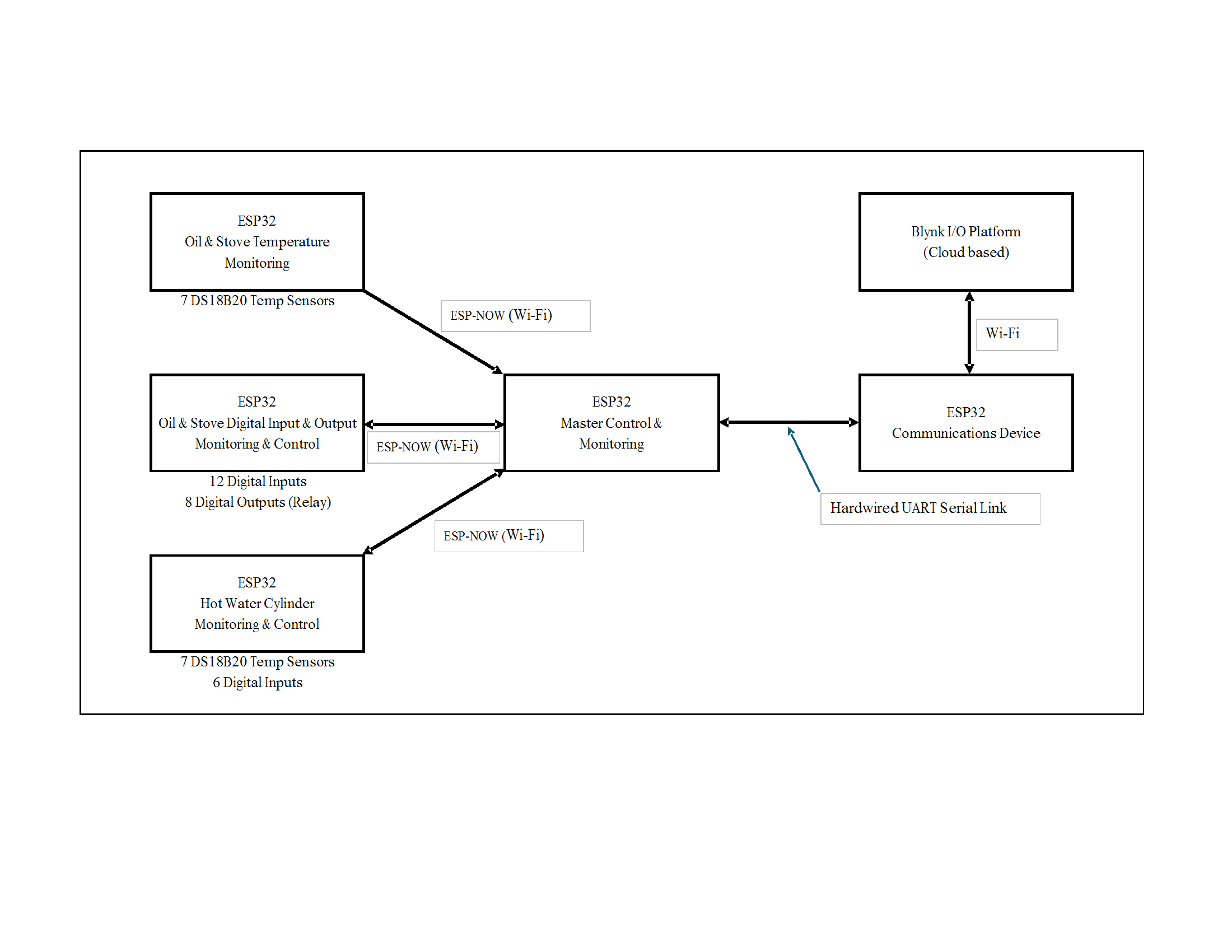 Over the last 3 years mainly as a hobby, I have been building a project for the monitoring of my home’s central heating and hot water systems with the view to improving efficiency. I based the system on the ESP32 and although far from an expert I have become reasonably proficient at programming the ESP32 using Arduino IDE and coding in C++. I attach a simple sketch of the existing network, but briefly I have 3 local ESP32’s with hardwired I/O for monitoring temperatures (14), digital inputs (18) and digital outputs (8). These 3 ESP32’s are connected to a Master ESP32 by ESP-NOW (on board Wi-Fi). The Master ESP32 collates and manipulates monitoring data and forwards the received data to a 5th ESP32 via a hardwired UART serial link. This communications ESP32 then extracts the data from the serial link and processes it for sending by Wi-Fi to the Blynk IOT Platform.