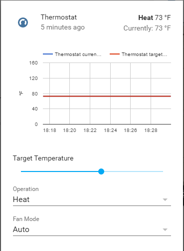 I can click on the Operation and Fan Mode dropdowns and get the options associated with those but the temperature adjustment is in half-degree increments in HA whereas in Vera and on the actual unit itself, it is in whole degree increments. Trying to adjust it from HA using the slider, it read 73.1. It completely ignored 73.6 and changing it to 74.1 in HA triggered the system on, but when I looked at the actual display on the unit itself it showed a set point of 71 degrees.
