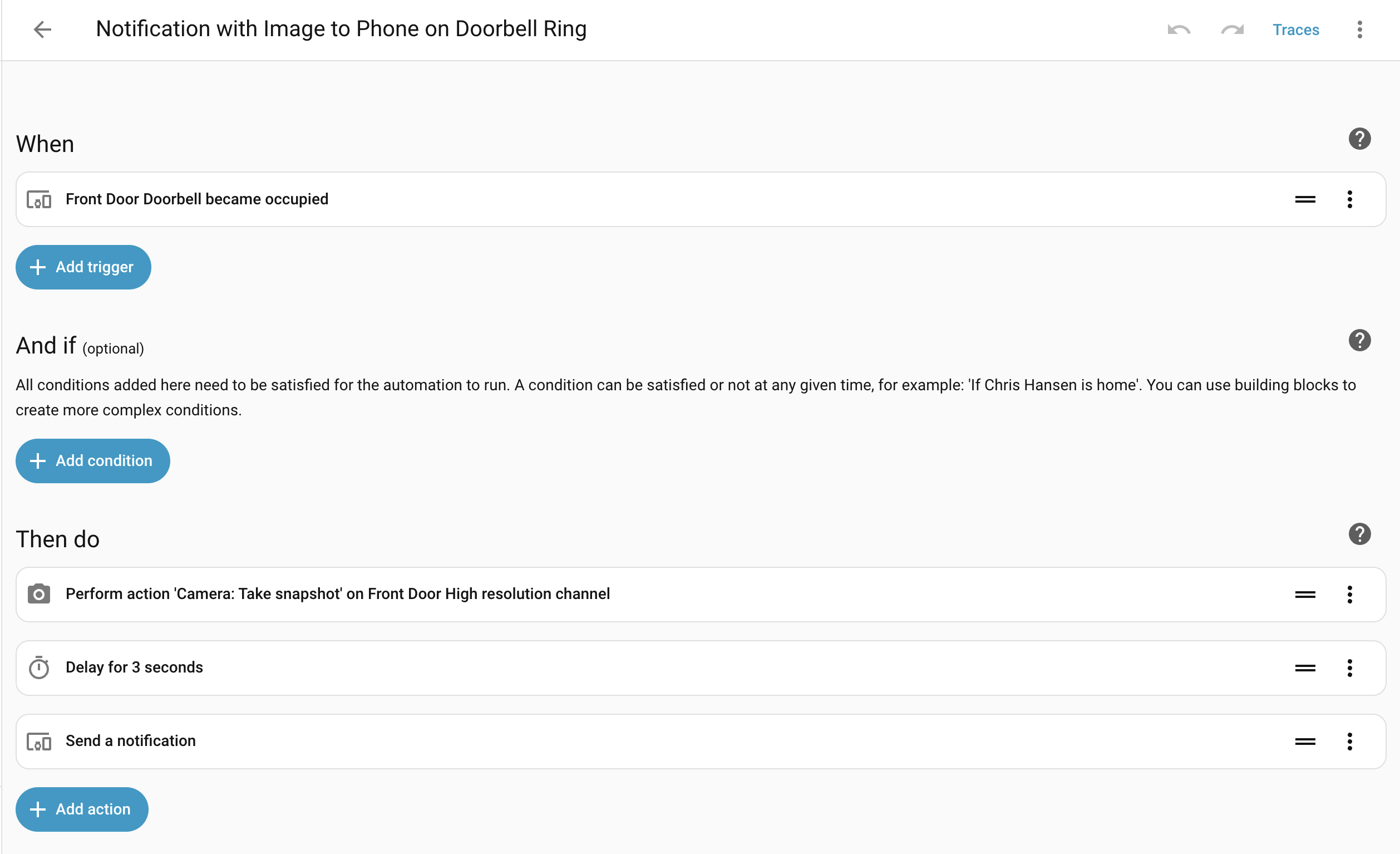 Thank you. That got me going in the general right direction and led me to other similar threads. I ended up modifying things and found the following works well. I’m using Unifi Cameras with a G4 Doorbell Pro, which uses “occupied” as the trigger for a doorbell press. The 3 second delay was to make sure it had time to save a new snapshot of that moment and the notification didn’t grab the old/prior snapshot. I’m very new to this stuff, so I’m sure it can be improved upon but it works for me.