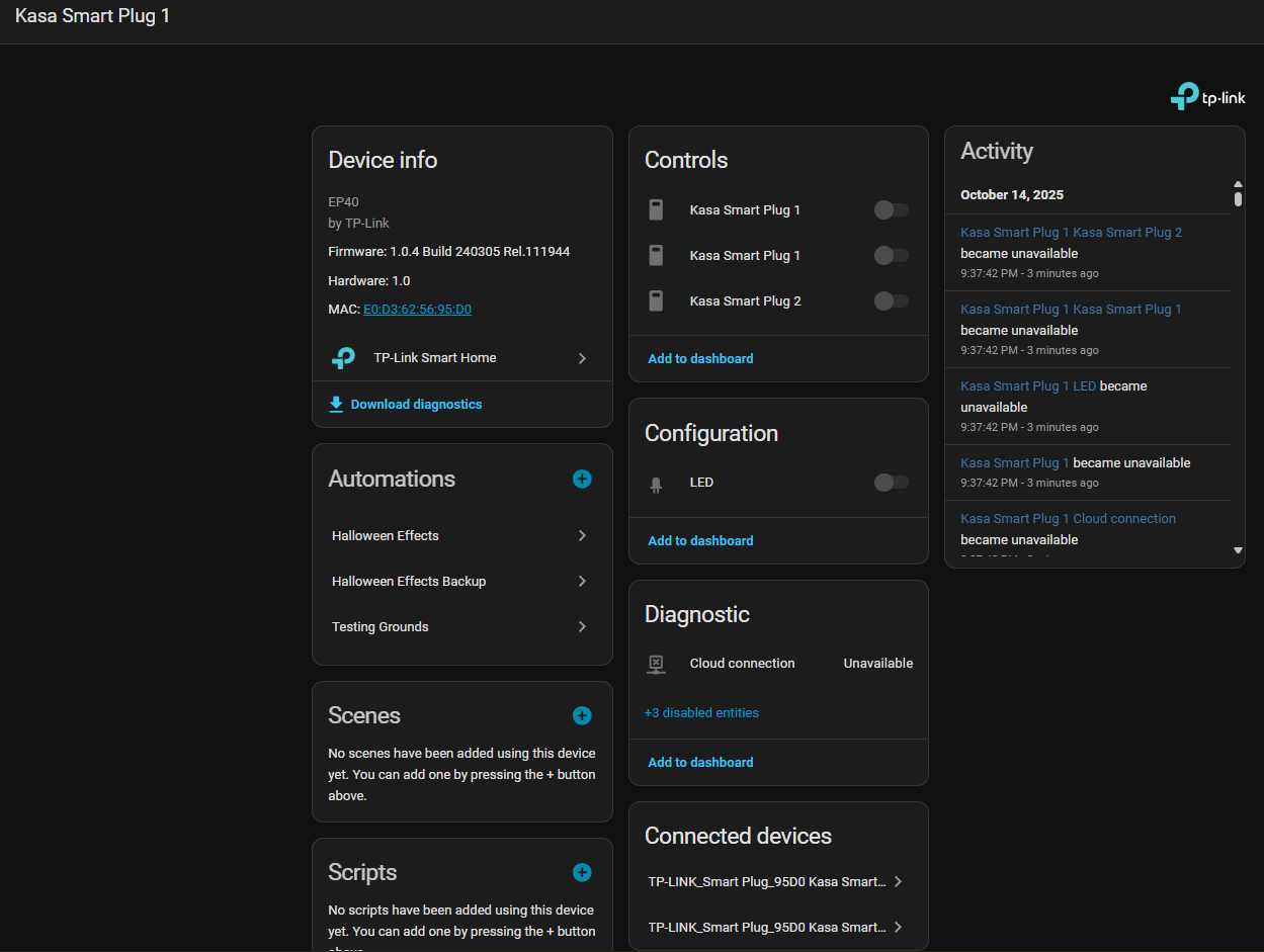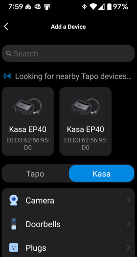 The problem here seems to be cause by Tapo app confusion when installing the Kasa EP40. It took me 3 attempts to install this using the Tapo app! At one point it was “seeing double”. Sometimes it would complete the setup and the devices were available but unresponsive. Junk!