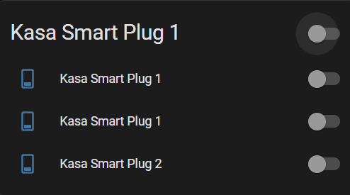 I bought a Kasa outdoor smart plug with 2 sockets. Somehow the names are duplicated. But even worse, if I add an action to turn off Plug 1 and Plug 2, only one socket is shut off. It gets even weirder though.
