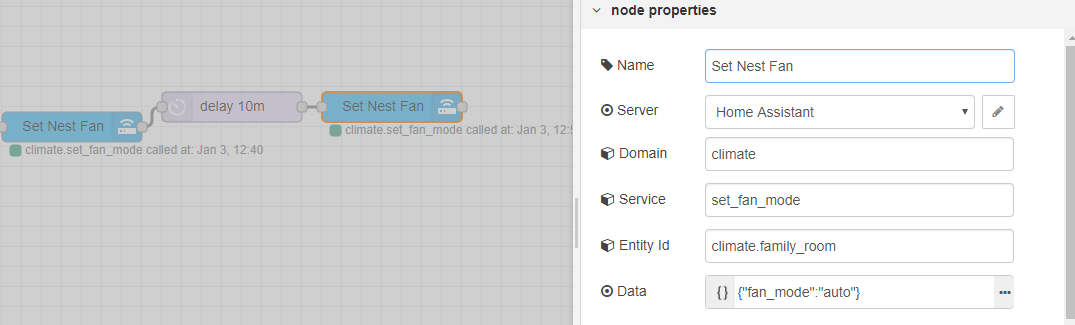 Not sure what’s going on here, seems like a very strange issue. My node-red automation service call setting my Nest thermostat fan mode to ‘on’ works just fine, but setting it back to ‘auto’ doesn’t. The service is being called, but it’s not actually doing anything. I can call the service manually from HA without issue, and I’m using the same JSON. Pics to show the settings of the two call service nodes, with how they are arranged (service ‘on’ on the left, back to ‘auto’ on the right).