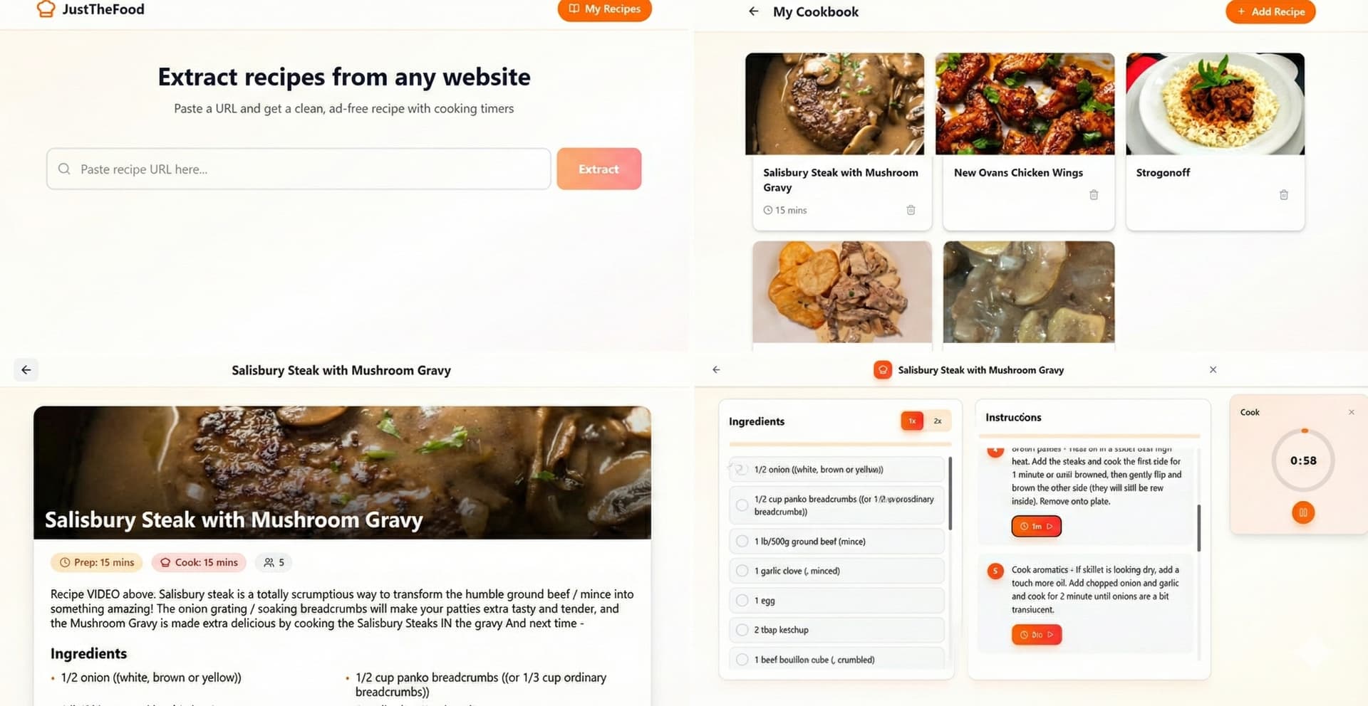 So, basically you paste the link it scrapes the page and give you a clean version of the recipe, only the ingredients and the steps, and let you save it in your cookbook, if the site doesn’t have the right metadata to get the recipe, it tries to go through some regex and if that’s not enough it sends the text to Gemini/OpenAI/Claude to extract the recipe.