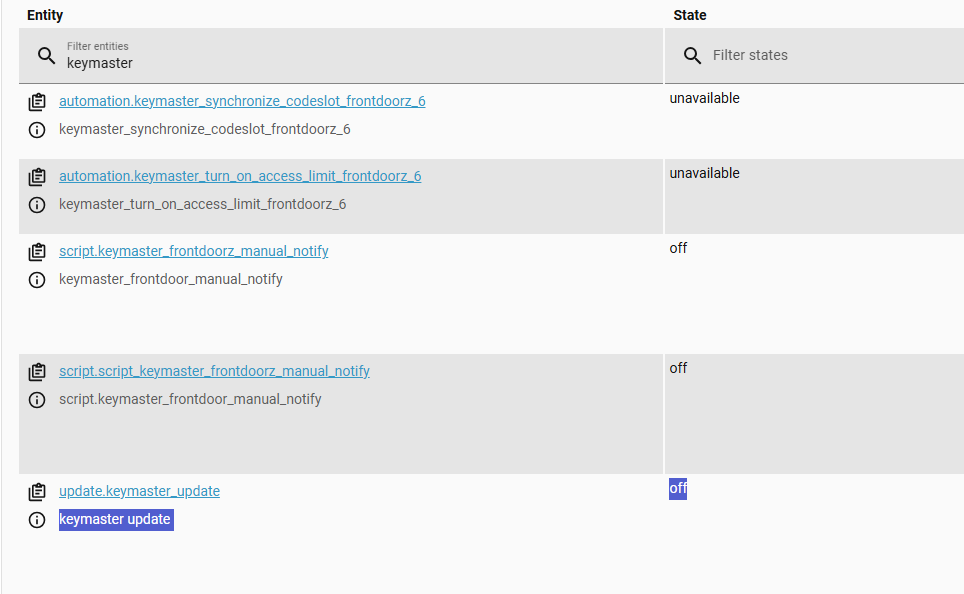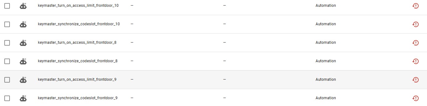 On the topic of the orphaned entities, when I added the ability to disable them I wasn’t able to find a clean way to clean-up the entities at the same time. So, yes, they are there, but you can easily remove them by going to your entities page and then filtering for Unavailable / Not provided. I would also recommend to add a filter for the Keymaster integration. Once you’ve done that you can enable the bulk select and select all entities and then bulk delete. All the entities that can be removed will be, you’ll still have some there after but those are expected as several of the entities are marked unavailable if certain conditions are not met.