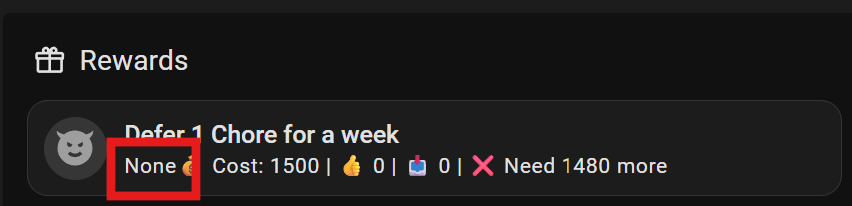 'secondary': reward_description ~ "š° " ~ ns.COST ~ ": " ~ reward_cost|string ~ " | š " ~ approvals|string ~ " | š„ " ~ claims|string ~