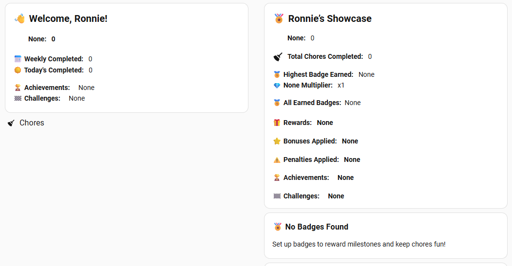 The dashboards are just a layer on top of the integration, so itās hard to tell much from those. First thing to do would be to go into the integration and see if the devices and entities are showing correctly. Then in developer tools to look for entities that are unavailable or have errors. There are a lot of good steps in the wiki to help get started. Troubleshooting: KidsChores Troubleshooting Guide Ā· ad-ha/kidschores-ha Wiki Ā· GitHub
