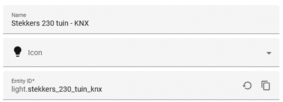 Take this example of an entry in the configuration.yaml file. The name is ‘Stekkers 230 tuin 8 KNX’