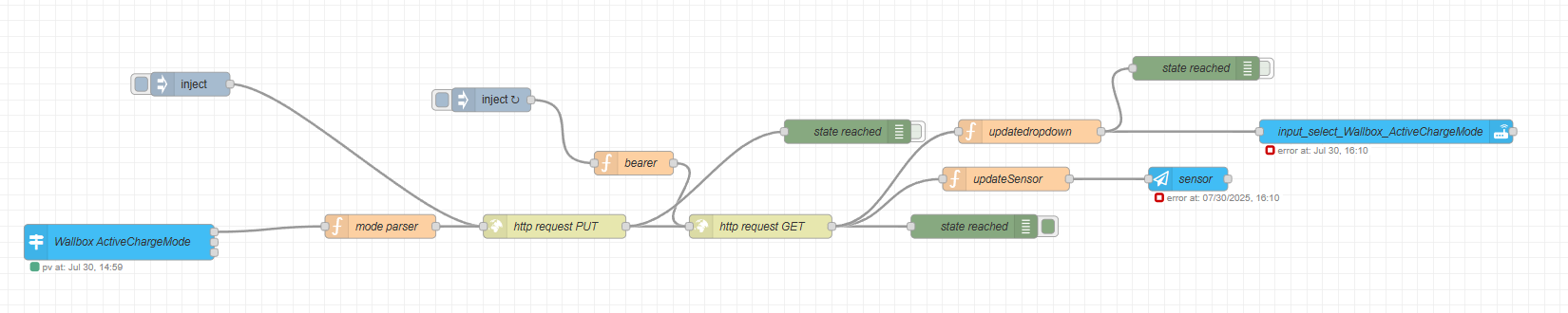 [{"id":"1c2c32c88581c620","type":"inject","z":"cf9db411ca071c46","name":"","props":[],"repeat":"5","crontab":"","once":false,"onceDelay":0.1,"topic":"","x":550,"y":920,"wires":[["63c0a7846f0d9def"]]},{"id":"63c0a7846f0d9def","type":"function","z":"cf9db411ca071c46","name":"bearer","func":"var msg1 = { payload: { \"mode\": 0, \"bearer\":0 } }\nmsg1.bearer = global.get(\"Kostal_bearer\") ;\nreturn msg1;","outputs":1,"timeout":"","noerr":0,"initialize":"","finalize":"","libs":[],"x":730,"y":940,"wires":[["73ce9212b81f3379"]]},{"id":"73ce9212b81f3379","type":"http request","z":"cf9db411ca071c46","name":"http request GET","method":"GET","ret":"obj","paytoqs":"ignore","url":"http://192.168.178.161/api/e-mobility/config/chargemode","tls":"","persist":false,"proxy":"","insecureHTTPParser":false,"authType":"","senderr":false,"headers":[{"keyType":"other","keyValue":"Authorization","valueType":"msg","valueValue":"bearer"}],"x":890,"y":1020,"wires":[["af4da4c66b94f9c8","d922837769ba1bcc","9b7f04539fb8c74b"]]},{"id":"3da08757f403f1f9","type":"http request","z":"cf9db411ca071c46","name":"http request PUT","method":"PUT","ret":"obj","paytoqs":"ignore","url":"http://192.168.178.161/api/e-mobility/config/chargemode","tls":"","persist":false,"proxy":"","insecureHTTPParser":false,"authType":"","senderr":false,"headers":[{"keyType":"other","keyValue":"Authorization","valueType":"msg","valueValue":"bearer"}],"x":630,"y":1020,"wires":[["73ce9212b81f3379","9f8bb0b07fae6721"]]},{"id":"af4da4c66b94f9c8","type":"debug","z":"cf9db411ca071c46","name":"state reached","active":true,"tosidebar":true,"console":false,"tostatus":false,"complete":"true","targetType":"full","statusVal":"","statusType":"auto","x":1160,"y":1020,"wires":[]},{"id":"d922837769ba1bcc","type":"function","z":"cf9db411ca071c46","name":"updateSensor","func":"var msg1={};\n\nmsg1.entity_id = `sensor.Wallbox_CurrentActiveChargeMode`;\n\nmsg1.payload = {\n data: {\n state: msg.payload.mode,\n attributes: {\n 'name': 'Wallbox_CurrentActiveChargeMode',\n friendly_name: 'Wallbox_CurrentActiveChargeMode',\n icon: 'mdi:pulse'\n }\n }\n};\n\nreturn msg1;\n\n","outputs":1,"timeout":"","noerr":0,"initialize":"","finalize":"","libs":[],"x":1200,"y":960,"wires":[["25ef1c9c74581477"]]},{"id":"9b7f04539fb8c74b","type":"function","z":"cf9db411ca071c46","name":"updatedropdown","func":"var msg1={};\n\n\n\nmsg1.payload = {\n \"option\": msg.payload.mode\n};\n\n\n// msg.payload = {\n// domain: \"light\",\n// service: \"turn_off\",\n// data: {\n// entity_id: [grupo],\n// }\n// };\n\nreturn msg1;\n\n","outputs":1,"timeout":"","noerr":0,"initialize":"","finalize":"","libs":[],"x":1230,"y":900,"wires":[["337d69047b0532b5","f9607479d9b41f71"]]},{"id":"3882f4f45550bff1","type":"inject","z":"cf9db411ca071c46","name":"","props":[{"p":"payload"}],"repeat":"","crontab":"","once":false,"onceDelay":0.1,"topic":"","payload":"{\"mode\":\"grid\", \"mincharginpowerquota\": 0, \"minpvpowerquota\": 100}","payloadType":"json","x":190,"y":900,"wires":[["3da08757f403f1f9"]]},{"id":"a7046d486f71bf95","type":"function","z":"cf9db411ca071c46","name":"mode parser","func":"var msg1 = { payload: { \"mode\": 0, \"bearer\":0 } }\nvar SelectedMode = msg.payload\nvar mode\nif (SelectedMode === \"lock\") {\n mode = '{ \"mode\": \"lock\", \"mincharginpowerquota\": 0, \"minpvpowerquota\": 100 }';\n}\nelse if (SelectedMode === \"grid\") {\n mode ='{ \"mode\": \"grid\", \"mincharginpowerquota\": 0, \"minpvpowerquota\": 100 }';\n}\nelse if (SelectedMode === \"pv\") {\n mode = '{ \"mode\": \"pv\", \"mincharginpowerquota\": 0, \"minpvpowerquota\": 100 }';\n\n}\nelse if (SelectedMode === \"hybrid\") {\n mode = '{ \"mode\": \"hybrid\", \"mincharginpowerquota\": 0, \"minpvpowerquota\": 100 }';\n\n}\n\nmsg1.payload = mode;\nmsg1.bearer = global.get(\"Kostal_bearer\") ;\nreturn msg1;","outputs":1,"timeout":"","noerr":0,"initialize":"","finalize":"","libs":[],"x":410,"y":1020,"wires":[["3da08757f403f1f9"]]},{"id":"9f8bb0b07fae6721","type":"debug","z":"cf9db411ca071c46","name":"state reached","active":false,"tosidebar":true,"console":false,"tostatus":false,"complete":"true","targetType":"full","statusVal":"","statusType":"auto","x":1000,"y":900,"wires":[]},{"id":"25ef1c9c74581477","type":"ha-api","z":"cf9db411ca071c46","name":"sensor","server":"541ade28.b4a62","version":1,"debugenabled":false,"protocol":"http","method":"post","path":"/api/states/{{entity_id}}","data":"","dataType":"json","responseType":"json","outputProperties":[{"property":"payload","propertyType":"msg","value":"","valueType":"results"}],"x":1430,"y":960,"wires":[[]]},{"id":"337d69047b0532b5","type":"api-call-service","z":"cf9db411ca071c46","name":"input_select_Wallbox_ActiveChargeMode","server":"ba0f7c7d.deae9","version":7,"debugenabled":false,"action":"input_select.select_option","floorId":[],"areaId":[],"deviceId":[],"entityId":["input_select.wallbox_activechargemode"],"labelId":[],"data":"{\"option\":$join(payload.option,\",\")}","dataType":"jsonata","mergeContext":"","mustacheAltTags":false,"outputProperties":[],"queue":"none","blockInputOverrides":true,"domain":"input_select","service":"select_option","x":1560,"y":900,"wires":[[]]},{"id":"f9607479d9b41f71","type":"debug","z":"cf9db411ca071c46","name":"state reached","active":false,"tosidebar":true,"console":false,"tostatus":false,"complete":"true","targetType":"full","statusVal":"","statusType":"auto","x":1453.0435791015625,"y":828.0435180664062,"wires":[]},{"id":"6f5f9d3707cc17c5","type":"trigger-state","z":"cf9db411ca071c46","name":"Wallbox ActiveChargeMode","server":"ba0f7c7d.deae9","version":5,"inputs":0,"outputs":3,"exposeAsEntityConfig":"","entities":{"entity":["input_select.wallbox_activechargemode"],"substring":[],"regex":[]},"debugEnabled":false,"constraints":[],"customOutputs":[{"messageType":"default","messageValue":"","messageValueType":"json","comparatorPropertyType":"always","comparatorPropertyValue":"","comparatorType":"is","comparatorValue":"","comparatorValueDataType":"str