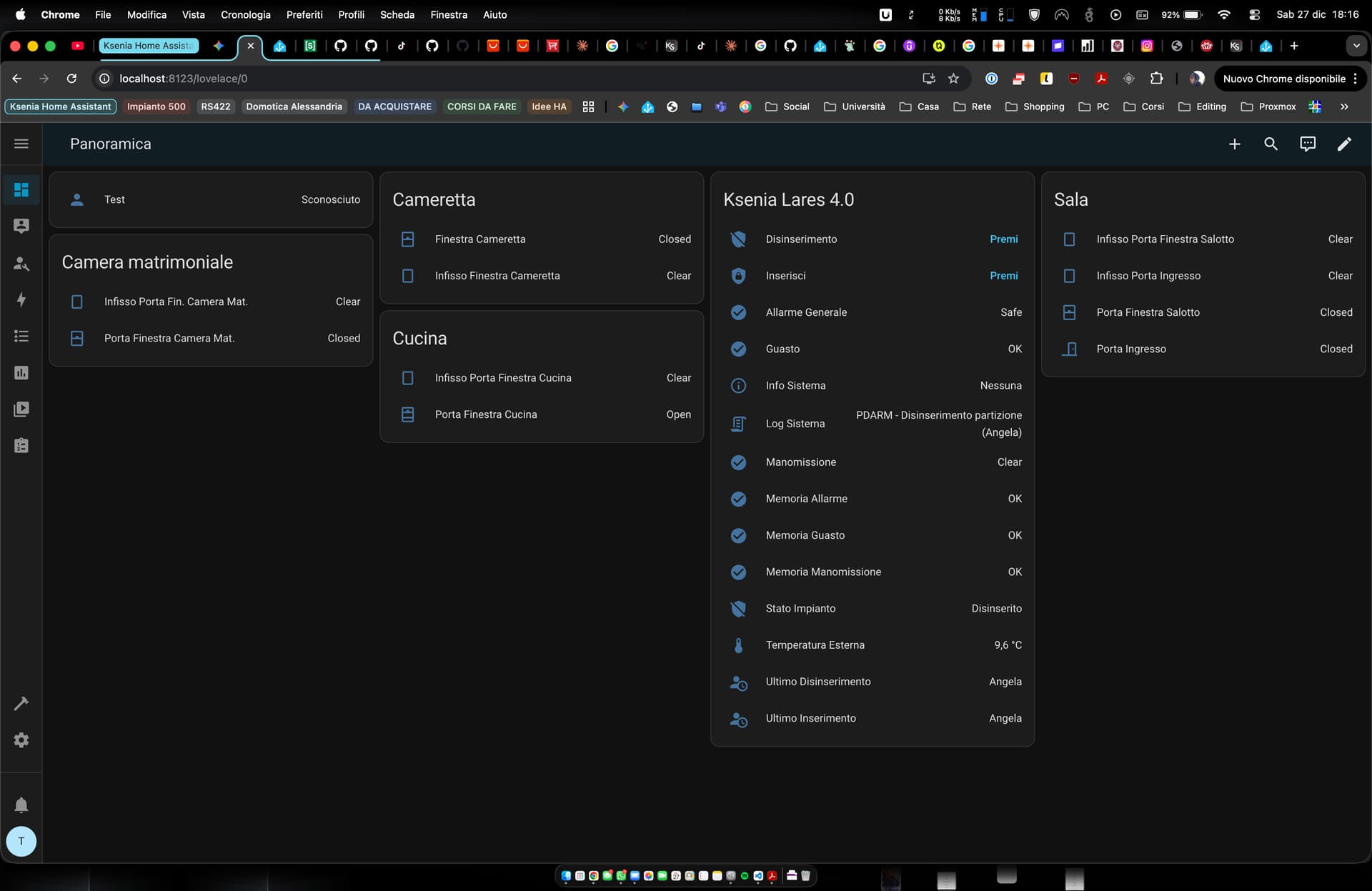 IT: Ciao a tutti, sto lavorando alla mia integrazione per la centrale Ksenia Lares 4.0. Attualmente sto riscrivendo da zero tutta l’integrazione per renderla funzionante in modalità “supervisore” e renderla praticamente identica all’integrazione di Control4 (dove per tutto ciò che riguarda l’allarme è in grado di richiedere un PIN utente diverso da quello del collegamento al WebSocket, mentre per tutto ciò che riguarda domotica e logs ha un suo PIN utente che può usare solo per queste azioni). Avevo inizialmente realizzato un’integrazione molto più basilare che funzionava in modalità “client” e che mi risolveva i problemi che riscontravo con l’integrazione di @lelegreco2002. Vi lascio uno screenshot di ciò che sono riuscito a fare fino ad ora nella vecchia integrazione.