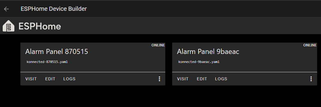 The Kennected Alarm Panel boards are automatically added and the flashing of the firmware is updated thru ESPHome whenever it finds a new firmware and prompts me to update them. I have never edited the .yaml for either of the 2 boards and all the previous firmware updates have gone thru with no issues of WiFi being reset back to the factory WiFi SSID. ![]()