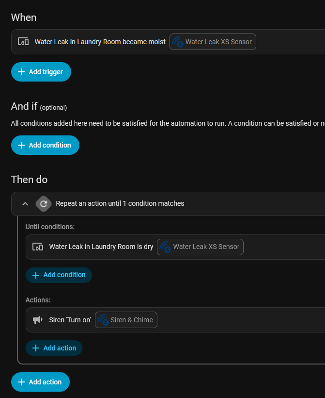 I setup the automation and w/o a repeat function, I can reliably get the 1-time Siren to work. But if I setup the automation to try to keep repeating the Siren message until the leak condition ends, it goes sideways. In fact, it seem to only actually siren until AFTER I remove the water trigger.