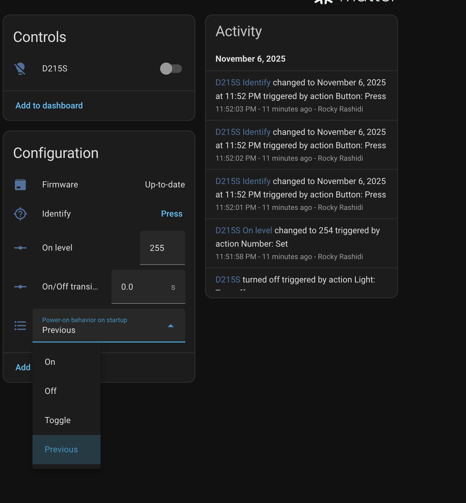 i just added a leviton smart switch D215S, using the matter integration in HA. Attached is a screenshot of the configurations . This is a switch and not a dimmer.