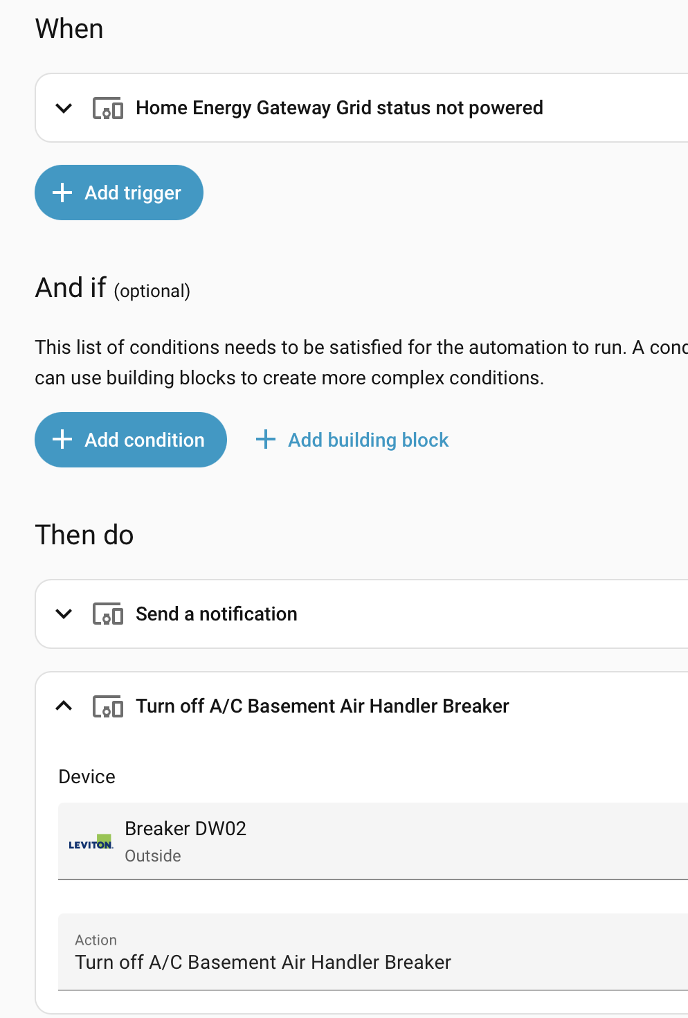 Since most of my most impactful loads (heat pumps, water heater, exterior lighting) are on the panel that just got installed today, I hadn’t set up my “in case of power failure” automation yet. But as a first step, I have long had an automation in HA set up to detect when the grid is cut and battery backup starts; so far, I just get a notification from HA, but my next project will be to also instruct the Leviton integration to switch off breakers. The option is pretty straightforward, see screenshot (this would shut off air conditioning, as an example).