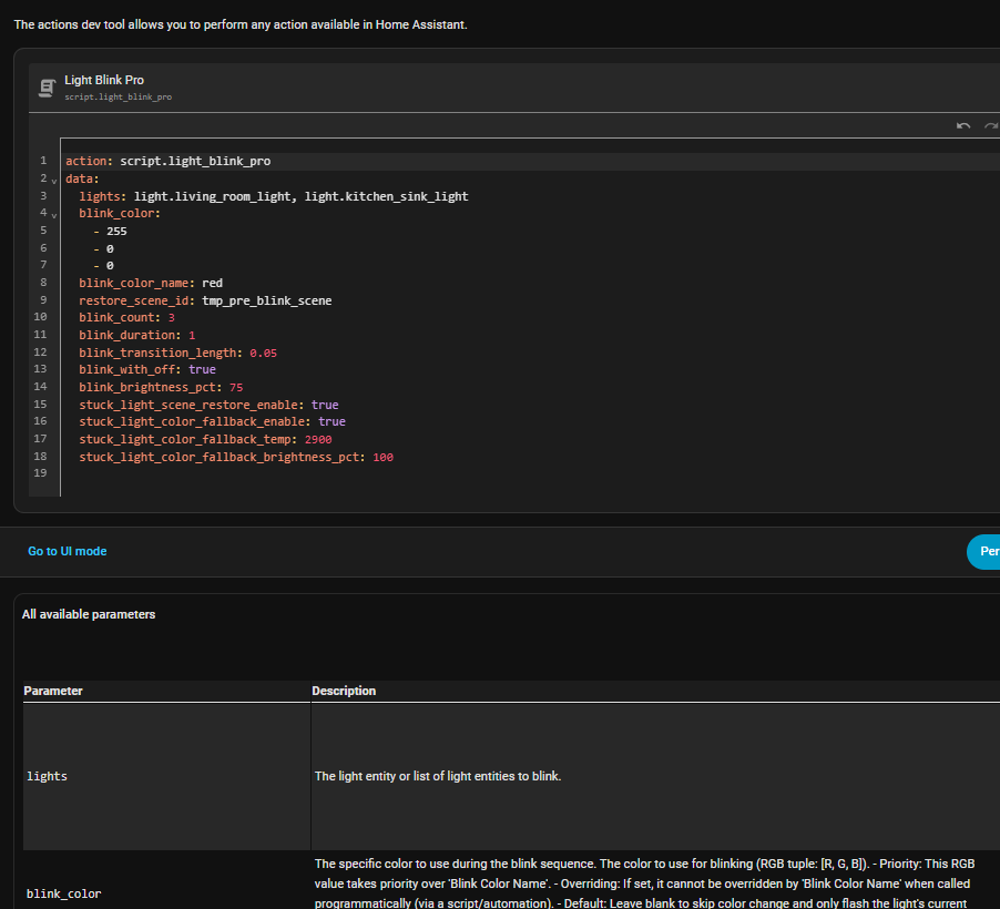 - Programmatic Override: All configuration details (lights, count, color, duration, etc.) can be passed when calling the script from an automation or another script. This allows a single blueprint installation to handle countless unique scenarios.
