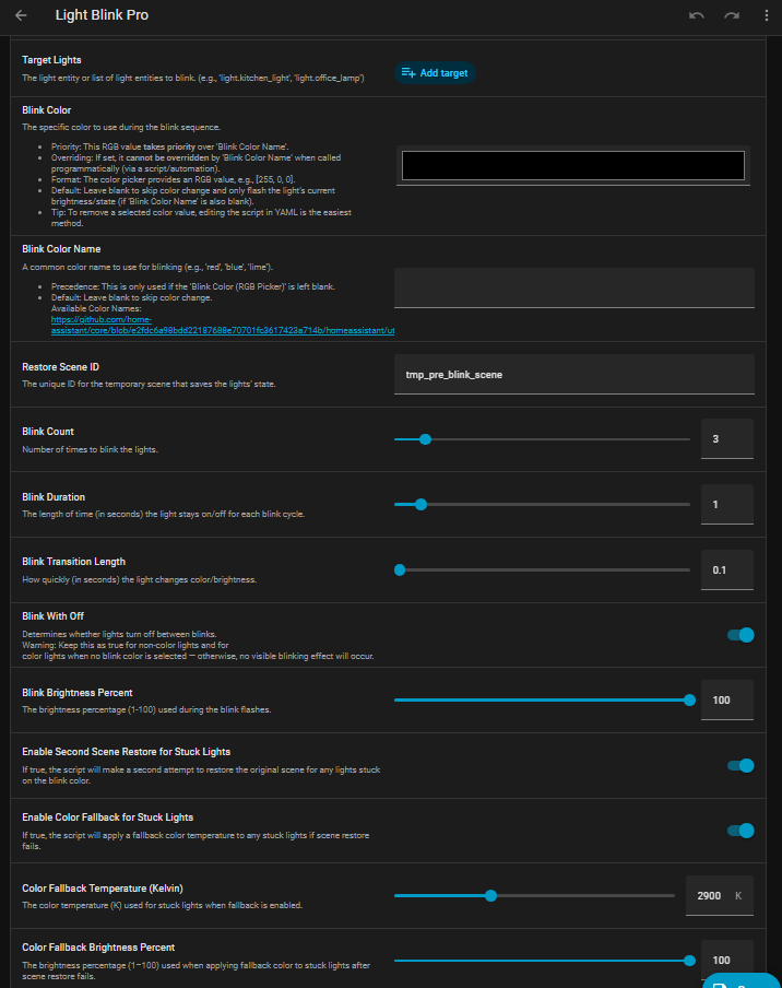 This blueprint provides a highly reliable and feature-rich way to make one or more lights blink for alerts, notifications, or visual feedback. It ensures lights always return to their original state and is designed for maximum compatibility across various light types.