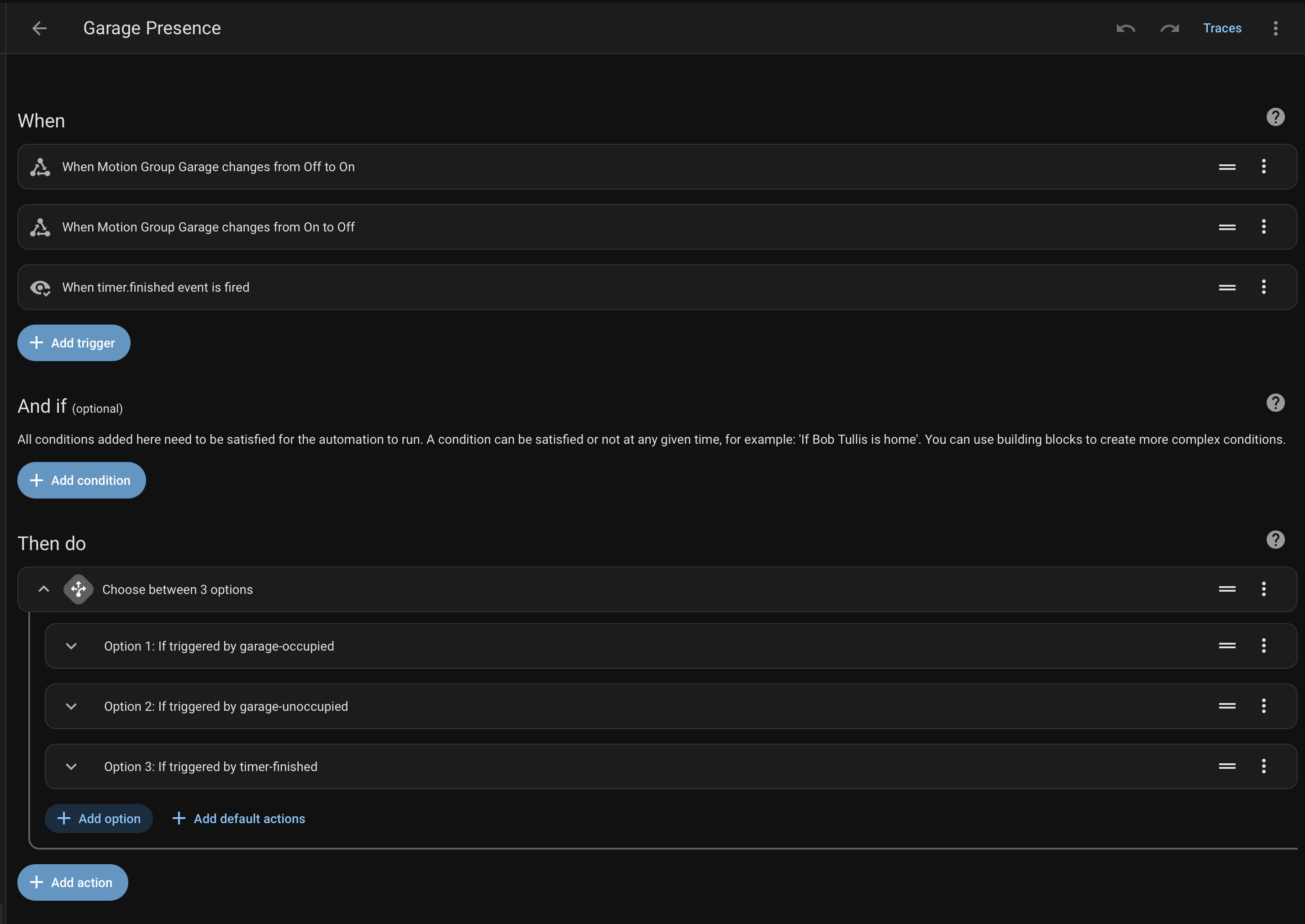 I also use Lutron Aurora rotary dimmers in a few of the locations where I also use motion or presence detectors - bear in mind I haven’t bothered (yet?) to add a routine to override motion/presence detection if the lights are manually turned on (just don’t have the need - yet ). That said, here’s the automation I use with a Timer Helper for my garage. . . if I’m under/behind something doing a repair, the lights will dim to let me know I have 4 minutes before the lights will time out.