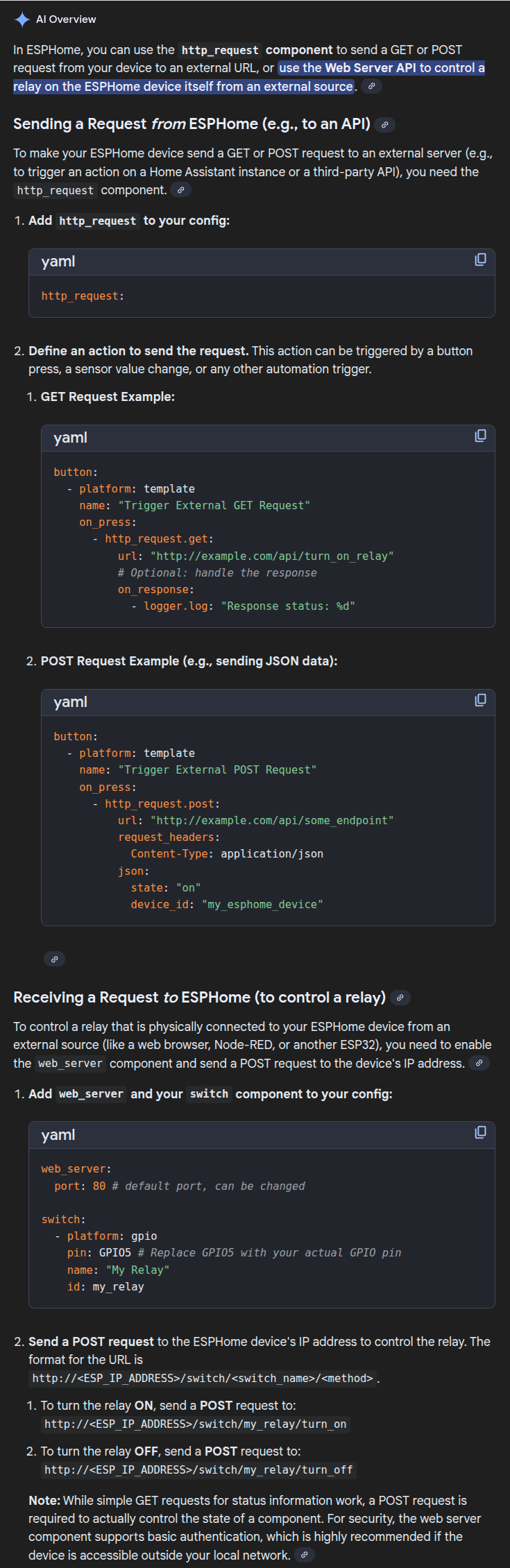 So for anyone that stumbles on this, I found my working solution. Apparently with the recent changes to ESPHome, in order to do actual device control, ESPHome requires that to be done through a POST request. You can no longer do it through the simple GET request method that I was originally using. I found this info through a google search and this is what the AI posted. I have it as a screenshot because I couldn’t find a single URL with this information.