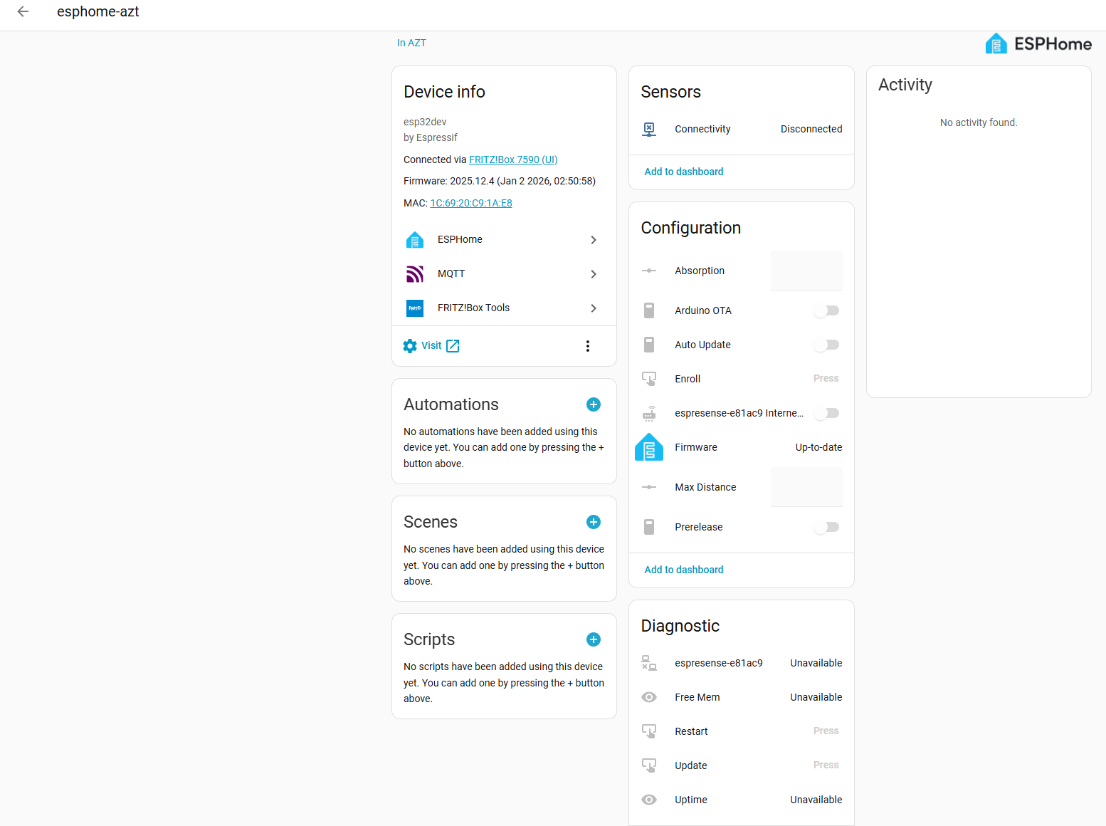 INFO ESPHome 2025.12.4 INFO Reading configuration /config/esphome/esphome-azt.yaml... INFO Starting log output from 192.168.178.186 using esphome API INFO Successfully resolved esphome-azt @ 192.168.178.186 in 0.000s INFO Successfully connected to esphome-azt @ 192.168.178.186 in 0.001s INFO Successful handshake with esphome-azt @ 192.168.178.186 in 0.062s