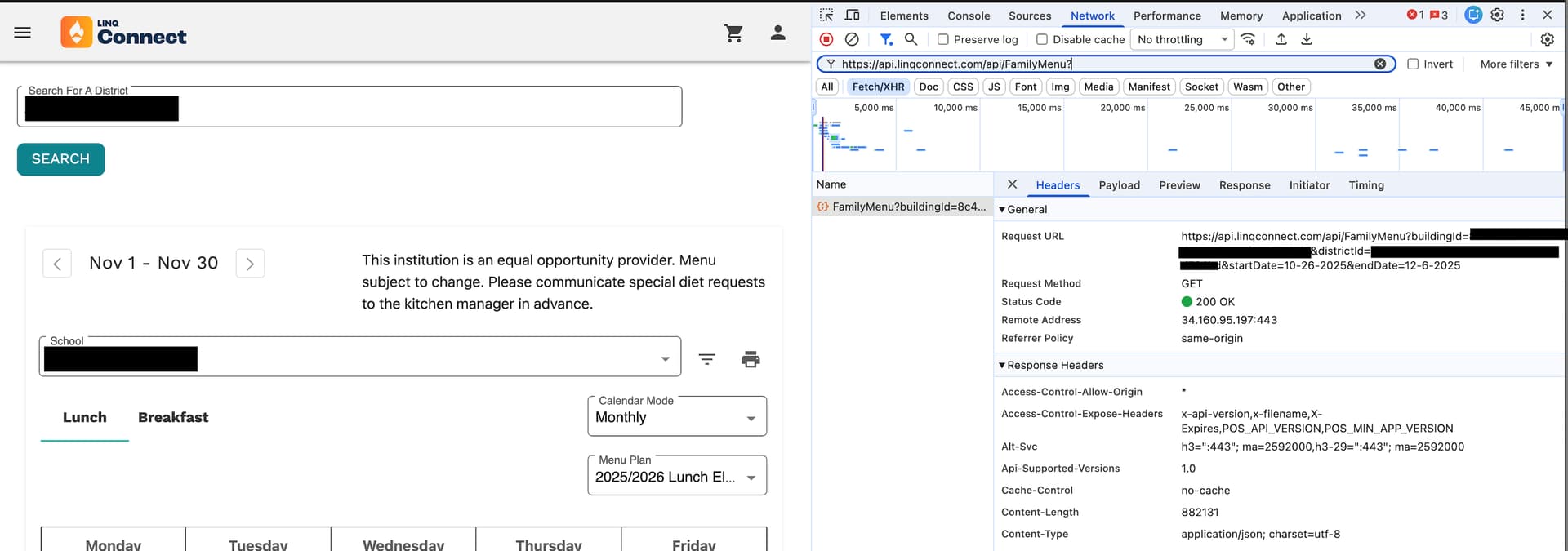Hi there - I was wondering if anyone has had any success tapping into the LinqConnect school lunch API to display menus, similar to the thread below: