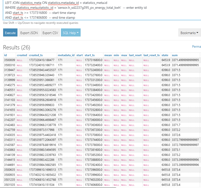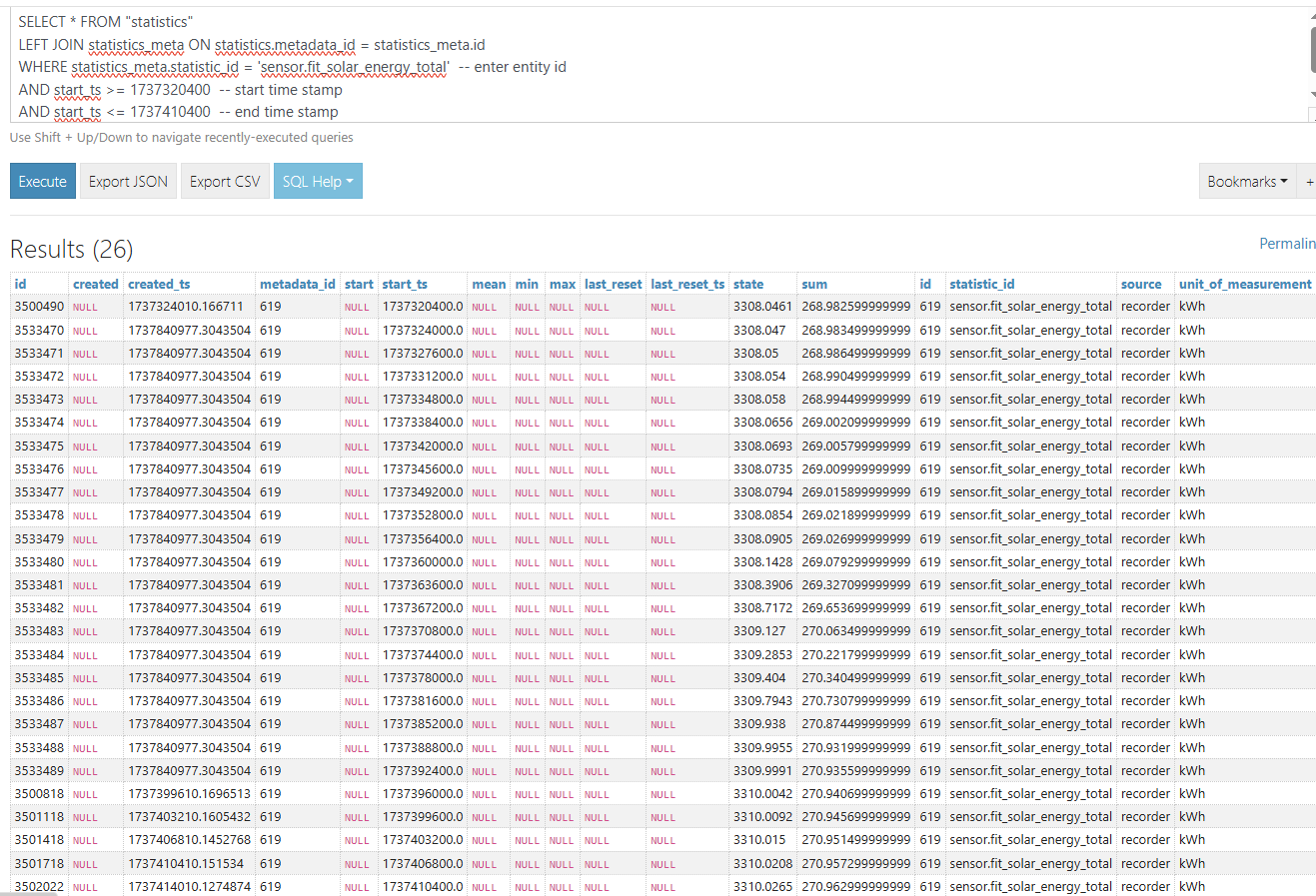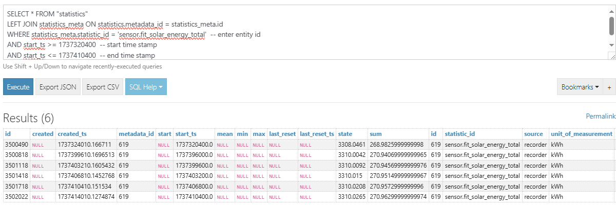 - View the updated statistics by re-running the query from step 4 above, viewing the energy dashboard and looking at the entity state history in the history graph for the selected date/time period.
