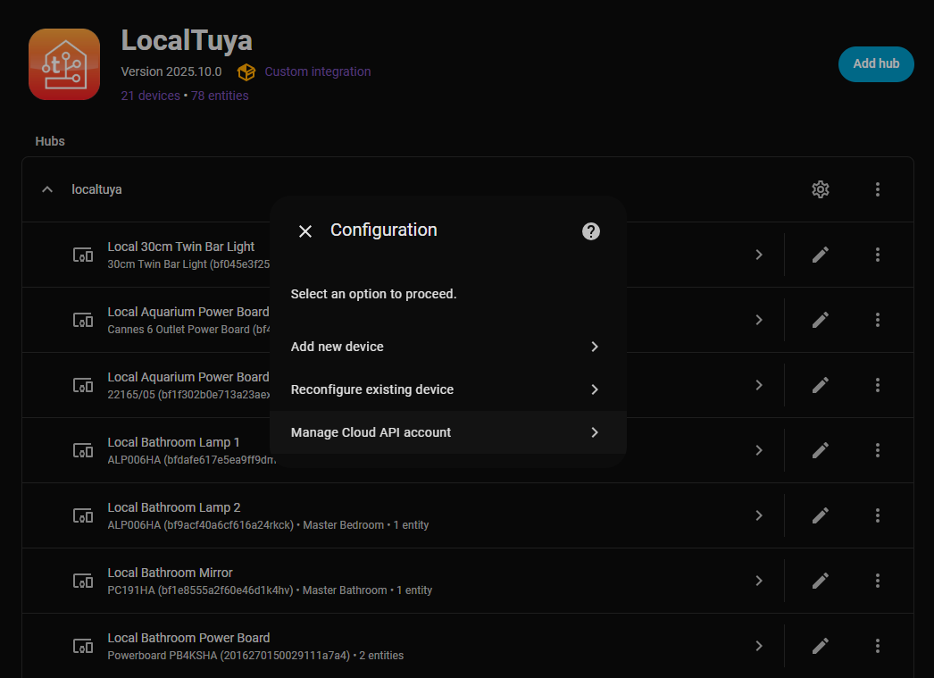 Re-Enter these details into the Local Tuya Integration. Manage Cloud API account