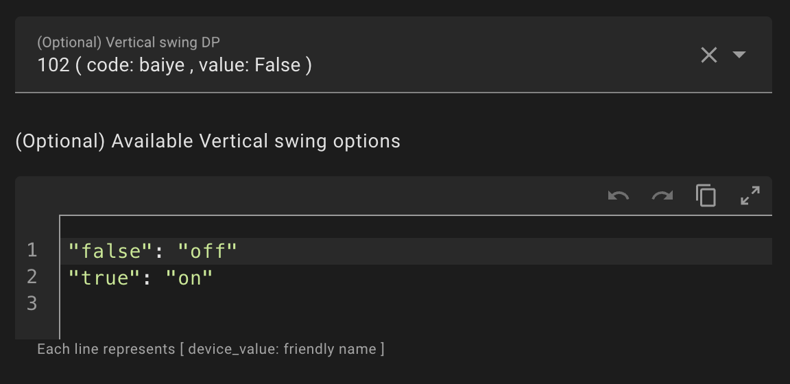 Hi, I’m trying to add the vertical swing control into the climate entity of the wall mounted heater, but the configuration device_name:friendly_name of the (Optional) Vertical swing options didn’t work for my device