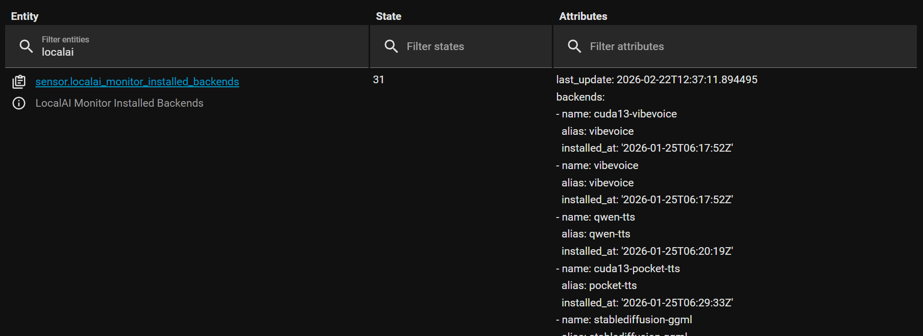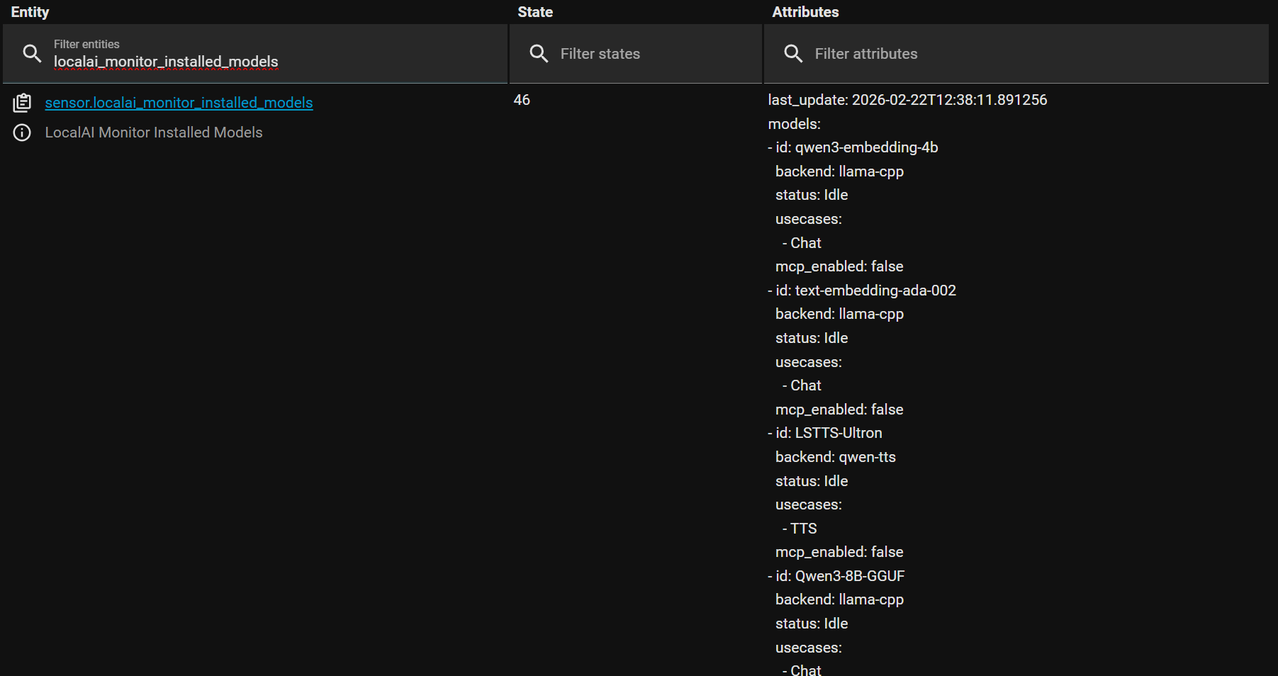 So, using the built-in LocalAI API I’ve built an integration that does just that: loryanstrant/HA-LocalAI-Monitor: An integration for Home Assistant that provides information about your LocalAI instance.
