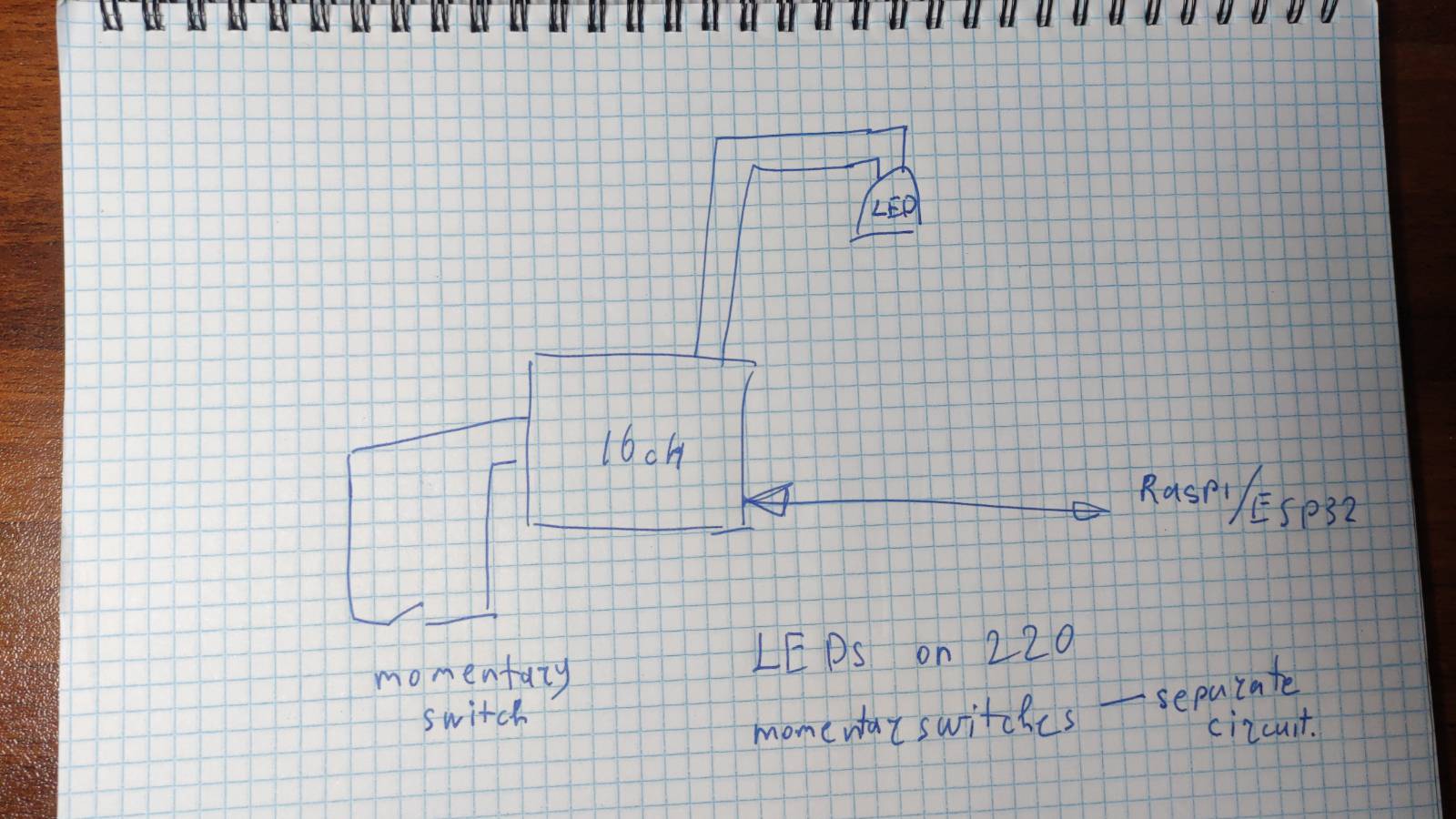 yes, 16 momentary buttons, 16 relays for LEDS and to connect to esp32 /raspberry. 16 momentary buttons has separate circuit and 16 leds has separate circuit on 220vac.