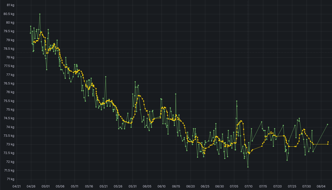 I am monitoring the results with Grafana and it has certainly helped motivate me to lose weight. This is the data since I started using it (also sharing this 'cause I am a little proud of myself ):