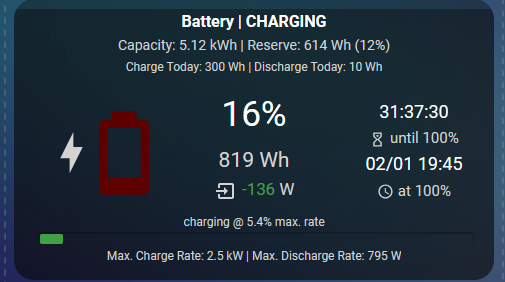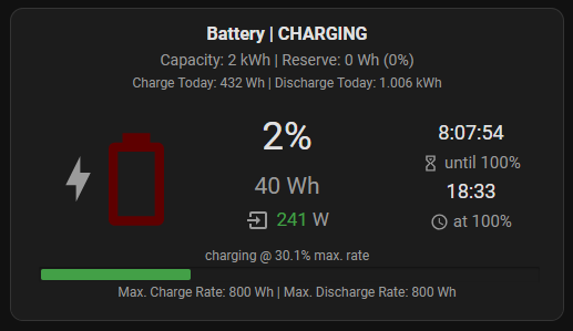 I like the format of this card. I uesd the custom settings to represent my Zendure battery. Almost there, but somehow the card does not show “Carging” state (nor the charging power) when the battery charges.