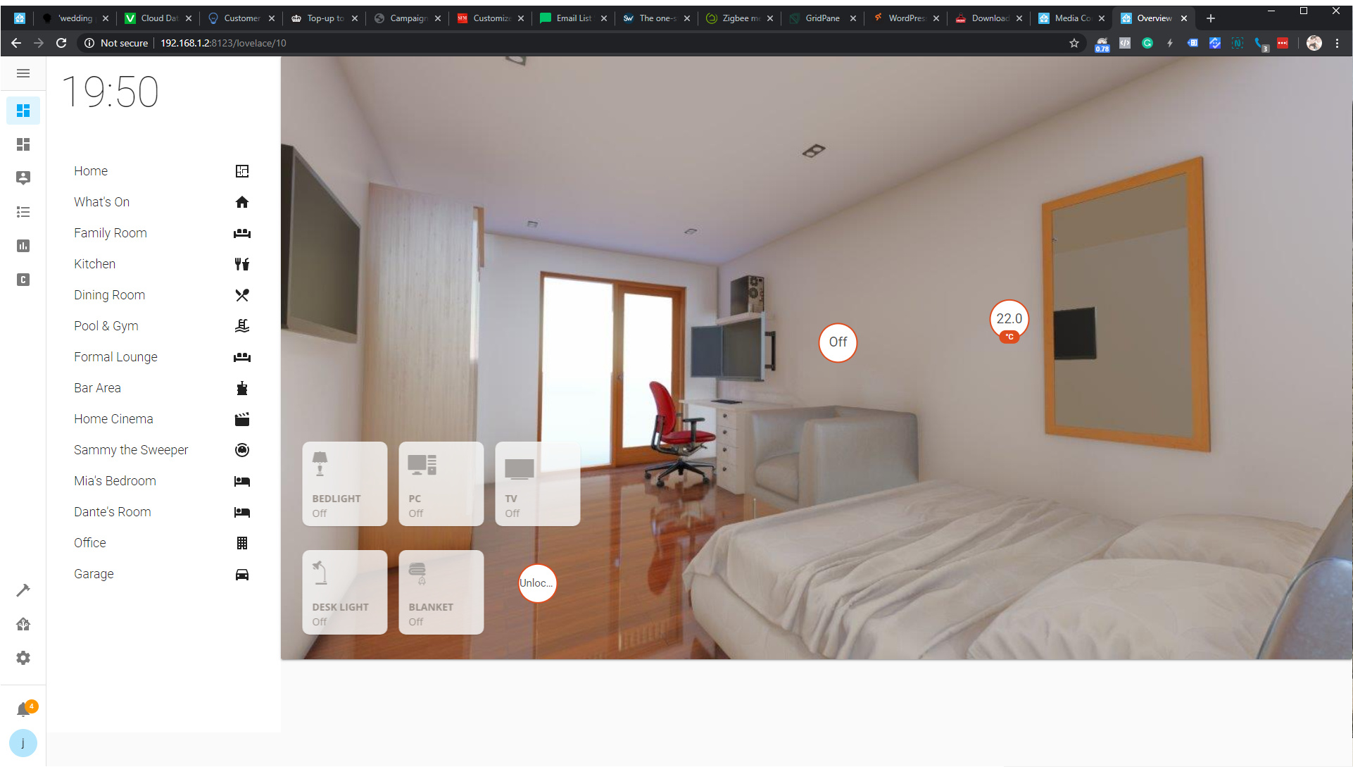 Blue means on, white means off. When I press de home-assistent icon the lights in the living room go on including the dining table, the icon next to that. When Iām pressing the movie button, it start a more dimmed light scene and by automation the left two icons are turing off.